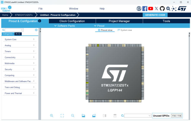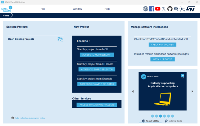 STM32CubeIDEとSTM32CubeMXのインストールが完了したら、次はCubeMXでプロジェクトを作成します。以前はCubeIDE内からCubeMX相当の設定ができましたが、本記事ではCubeMXで生成→IDEでビルドの流れで進めます。