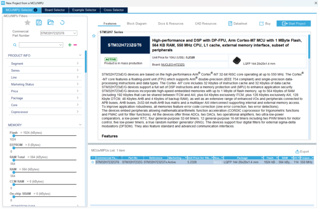 左上のPart Numberに「STM32H723ZGT6」と入力して、右下のMCU ListからMCUを選択。右上のStart Projectをクリックします。