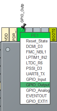 MCUから該当するピンをクリックして、「GPIO_Output」 を選択します。3つのピンを同様に設定したらLチカの準備完了です。