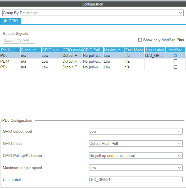 MCUが表示されて、ピンを設定していきます。今回はLチカ用にUser LEDに接続されているピンを設定していきます。