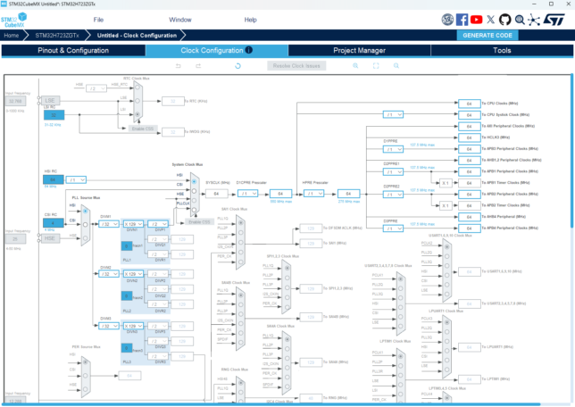 設定内容はすべて CubeMX のクロック設定画面から自動生成されます。