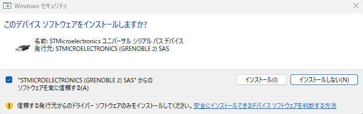 → 初回接続時に表示されます。公式ドライバなのでインストールしてOKです。