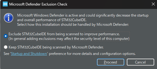 STM32CubeIDEでは、ビルド時に大量の中間ファイル(.o や .elf など)を生成します。これらを毎回スキャンするとビルド時間が長くなるため、IDE側が「除外すると高速になります」と提案してきています。基本的には開発環境のビルド生成物なので問題になりにくいですが、気になる場合は除外せずに進めてもOKです(その分ビルドが遅くなることがあります)。