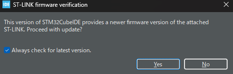初回書き込み時にST-LINKのファームウェアアップデートが発生する可能性があります。YesでファームウェアをアップデートしてOKです。