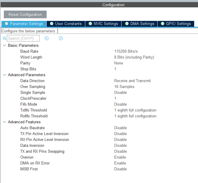 次に Configuration -> Parameter Settings から通信パラメータを設定します。デフォルト設定のままで問題ありませんが、下記のパラメータになっていることを確認します。