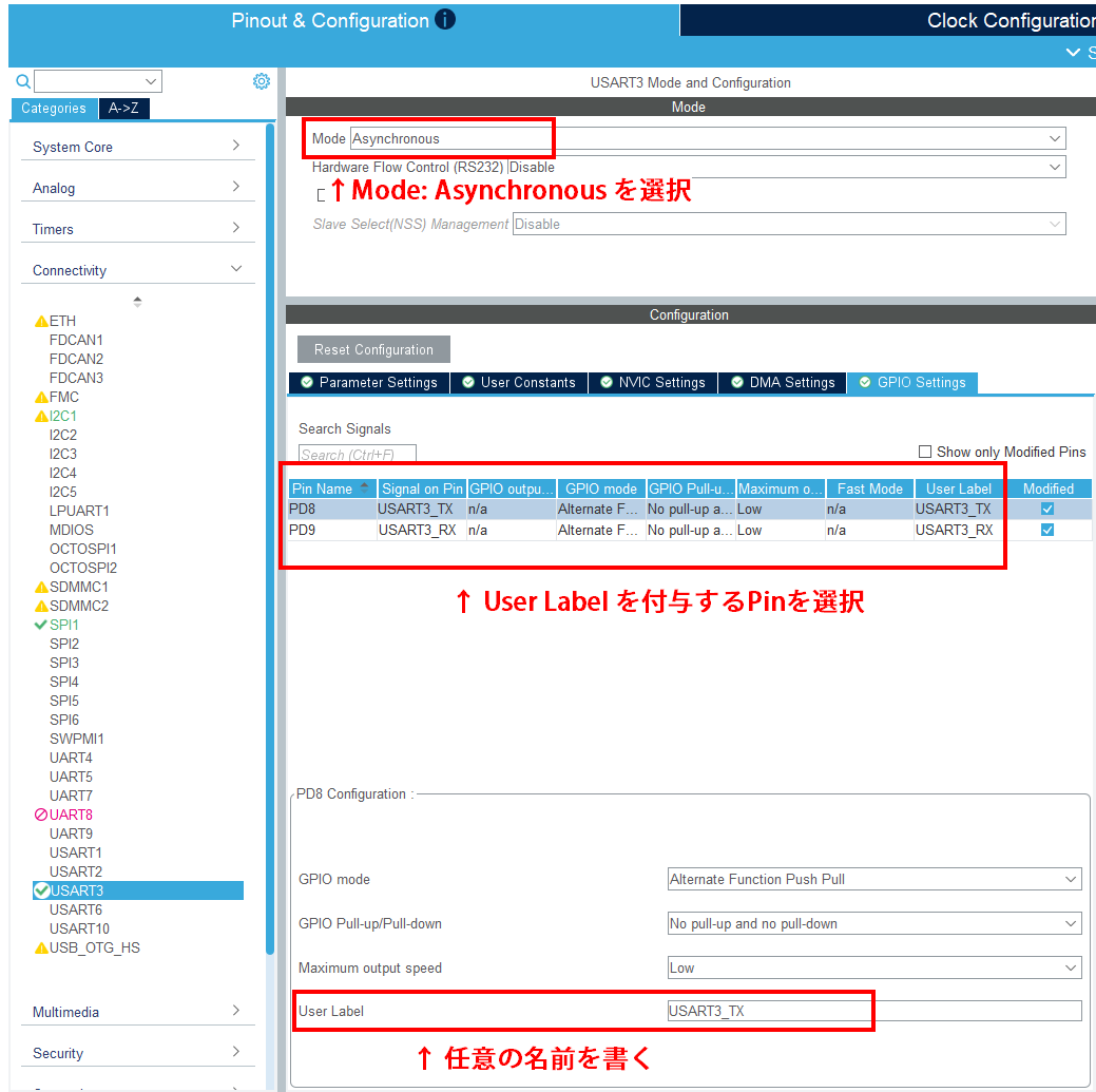 Mode Disable から Asynchronous に変更することで、UART(非同期)として動作し、通信設定が可能となります。合わせて PD8, PD9 ピンにUser Labelを付与しておきましょう。基本的にはSymbol Pinと同じ名前で良いかと。