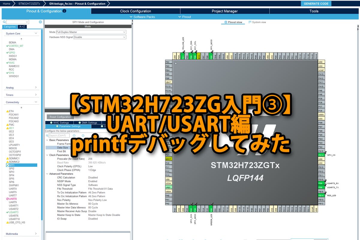 本記事では、STM32H723ZGでUSARTをUART(非同期)として使い、printfデバッグ環境を作っていきます。以降の開発(OLED、SD、FFTなど)で必須になるため、最初に土台を固めていきましょう。