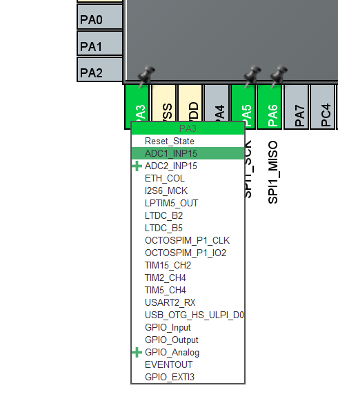 ADC1を有効化します。PA3を入力ピンとして、ADC1_INP15に設定します。