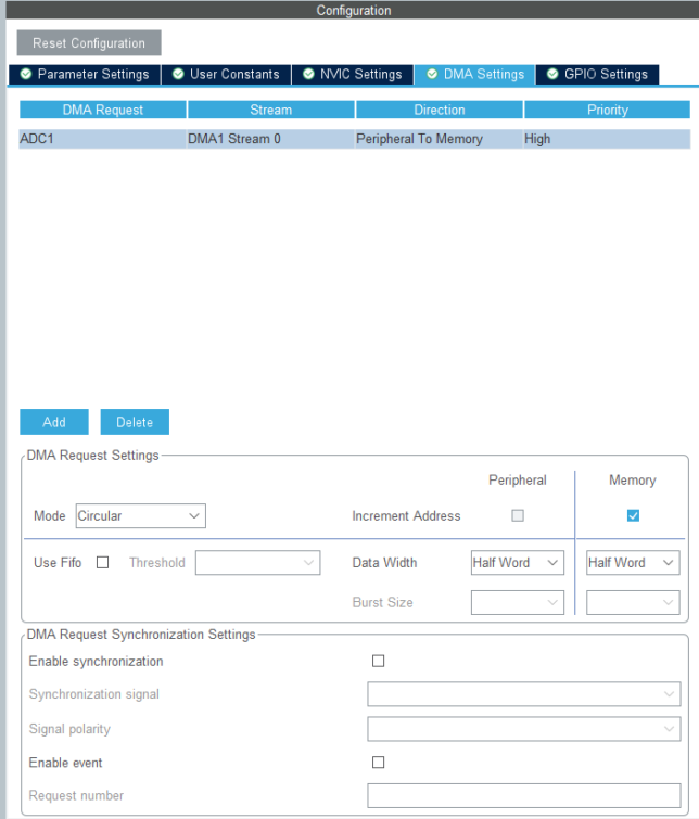 次に、ADCのDMA設定を行います。ADC設定画面のDMA SettingsタブからDMAを追加します。DMAの設定を以下のように変更します。