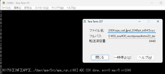 私は Tera Term ログで保存しています。注意として画像は例です。正弦波を入力していないので、値が極端に小さいです