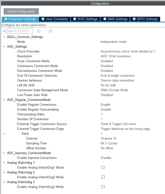 • External Trigger Conversion Source: Timer 6 Trigger Out event
