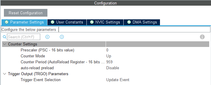 本記事では、TIM6のTrigger Out eventを使用してADC変換を開始しています。つまり、ADCのサンプリング周期はTIM6のタイマ周期によって決まります。TIM6の周期は、以下の2つの設定で決まります。