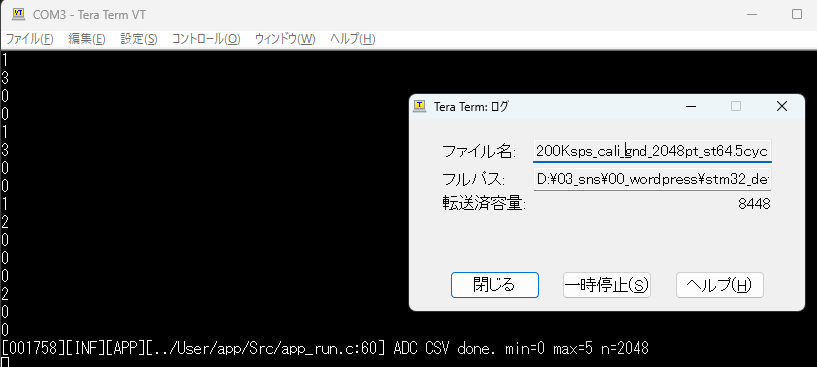 私は Tera Term ログで保存しています。注意として画像は例です。正弦波を入力していないので、値が極端に小さいです